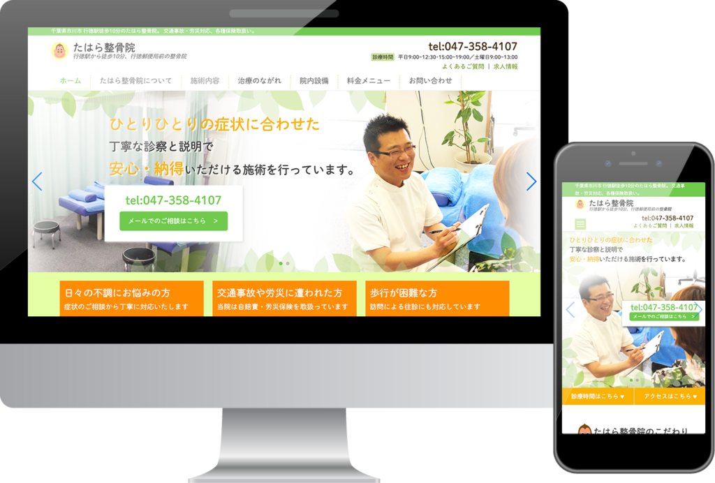 整骨院へ不安なくお越しいただきたいという願いを反映し、親しみやすさ・穏やかさ・優しい印象・明るい印象で製作しております。外観の特徴であるゴリラがHPの各所でポイントとして登場します。